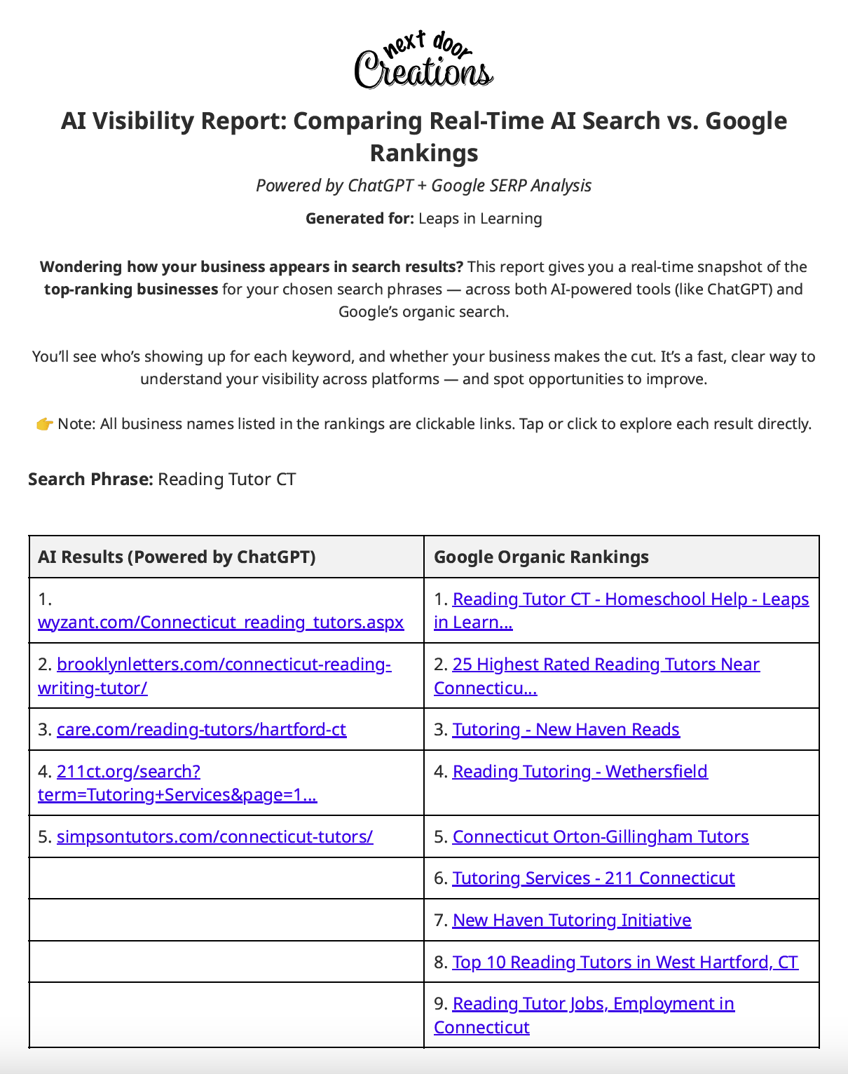 This report helps you measure your current visibility, see where the gaps are, and understand what actions will improve your discoverability.
